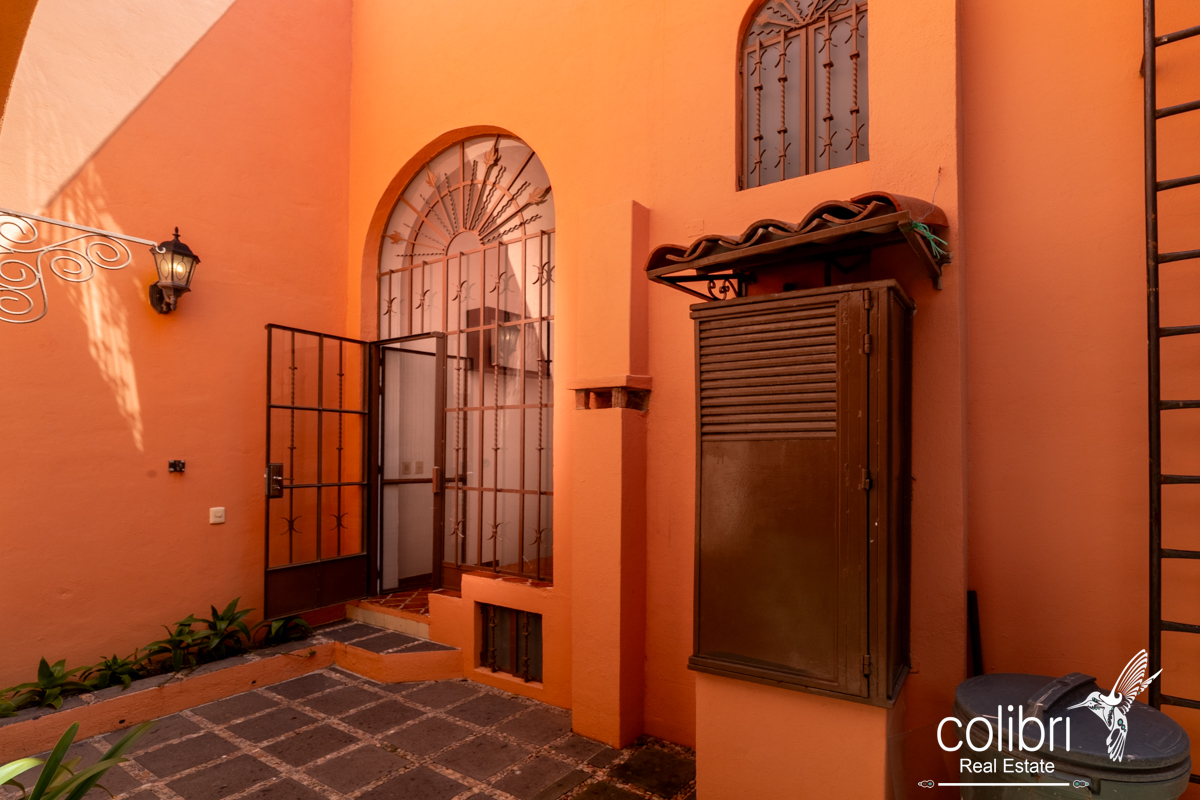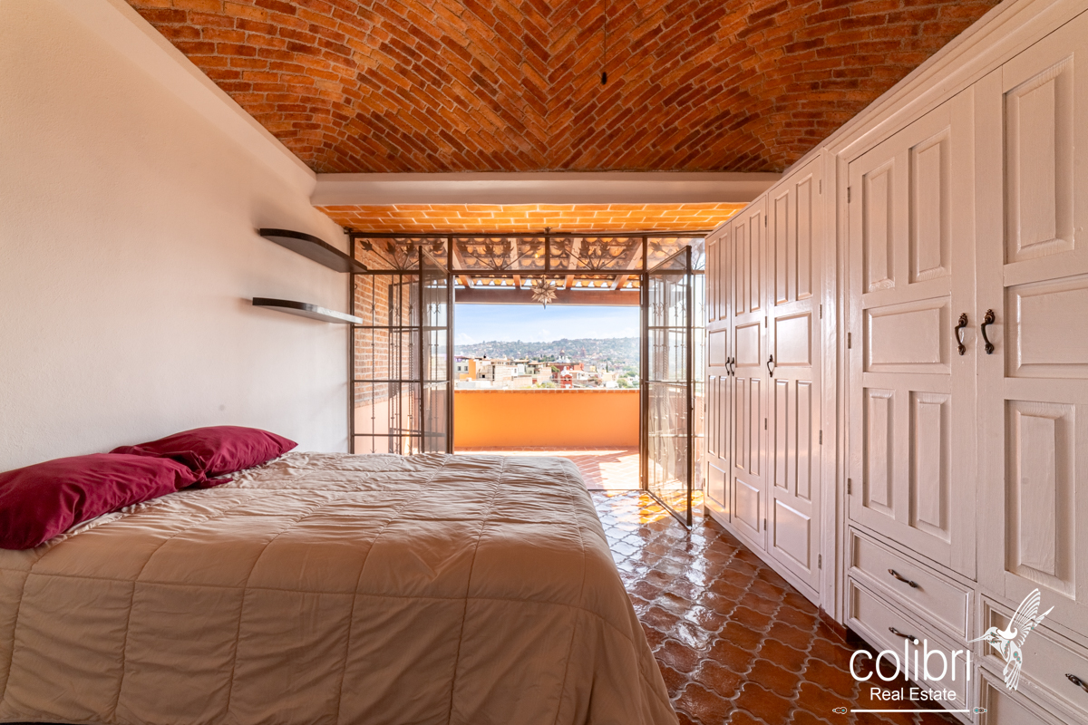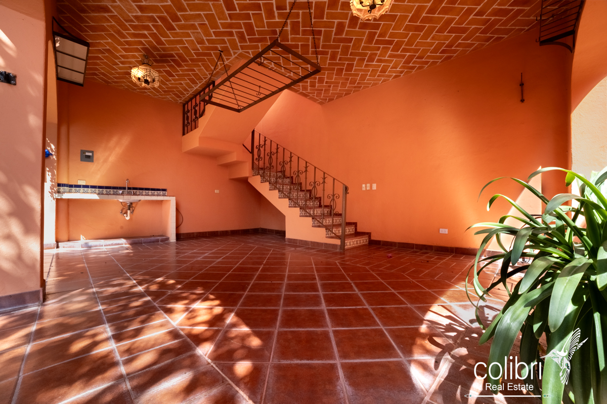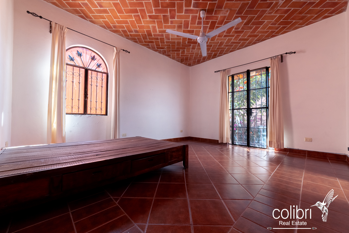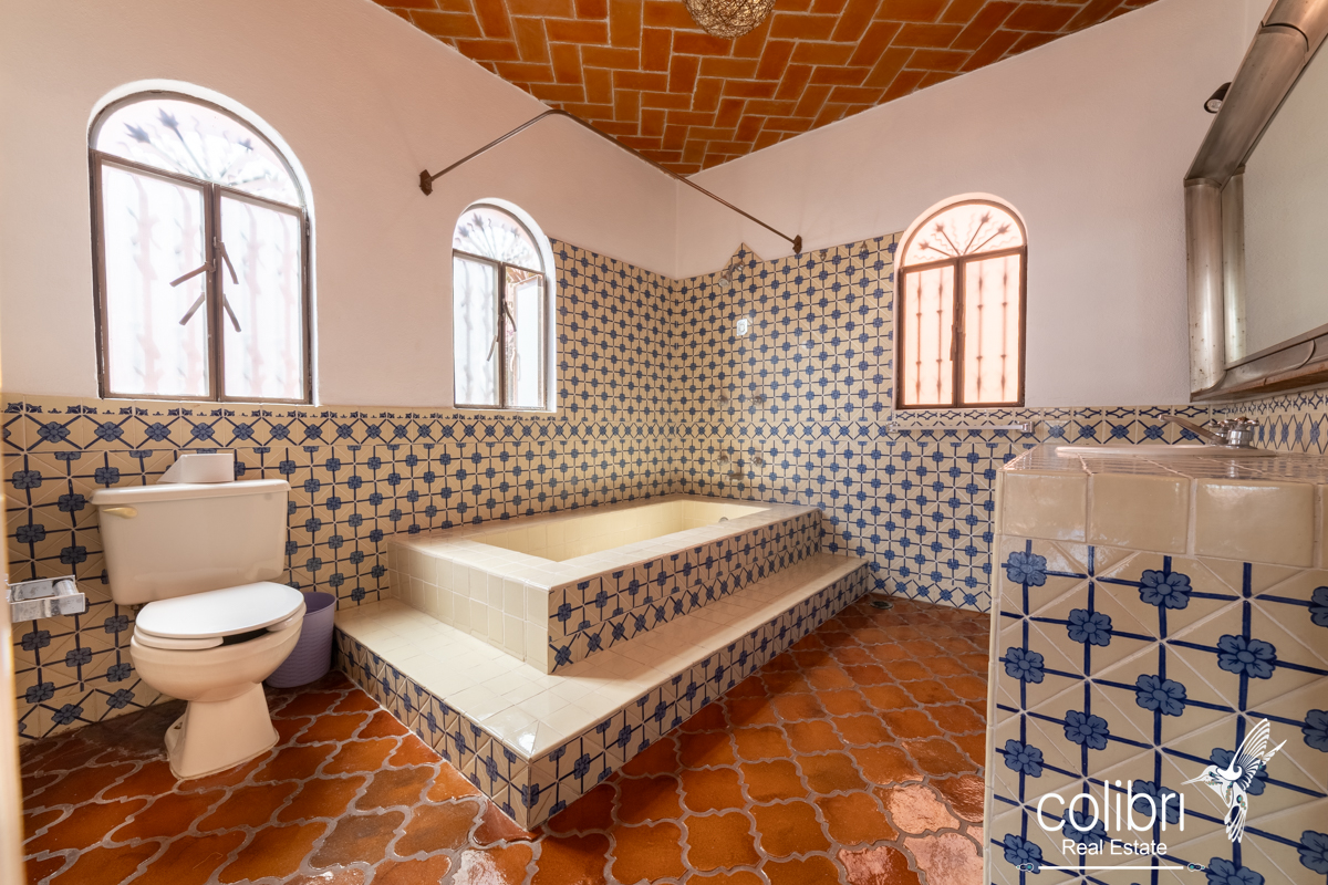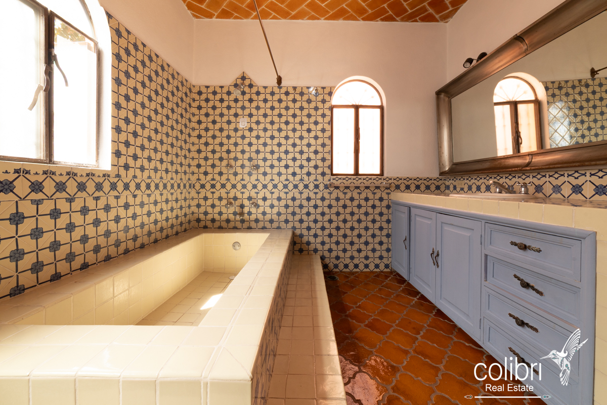 The second bedroom is located separately from the main building, offering complete privacy. Accessed via a staircase in the covered patio, it features its own balcony, bright windows, and a bathroom decorated with Talavera tile, maintaining the Spanish harmony that defines the entire home.