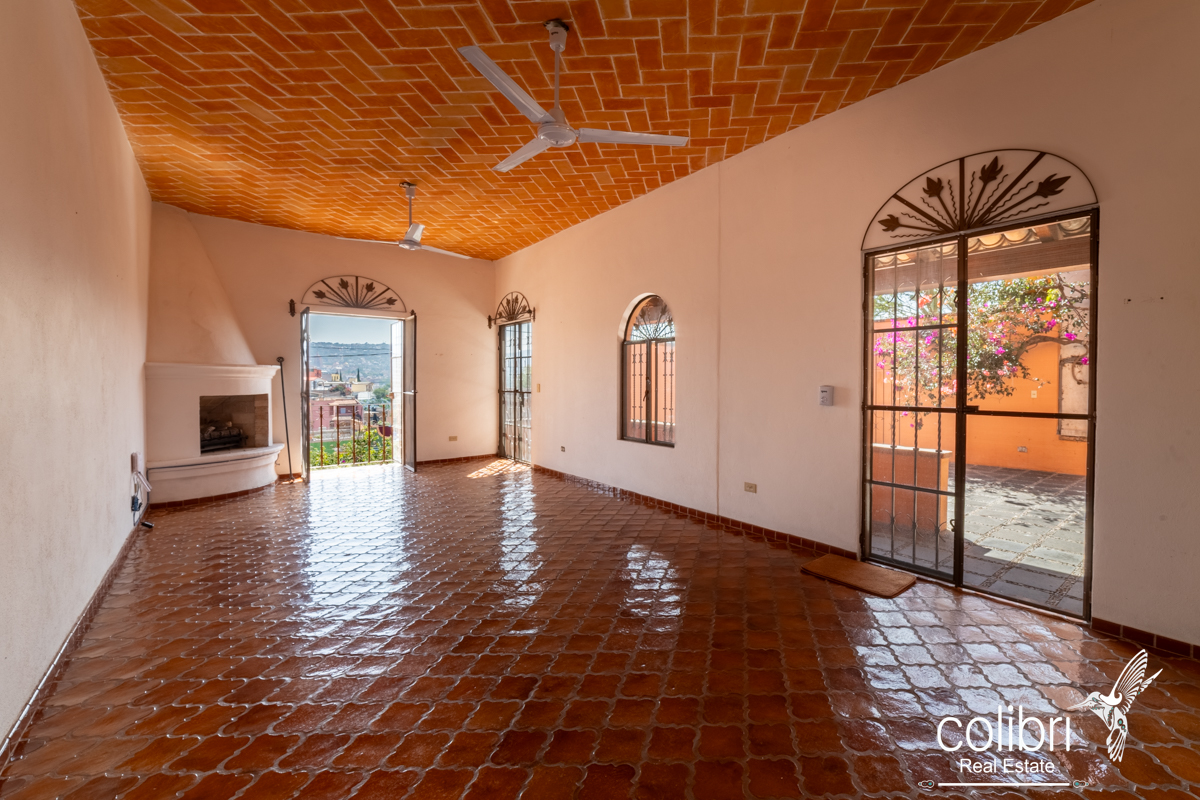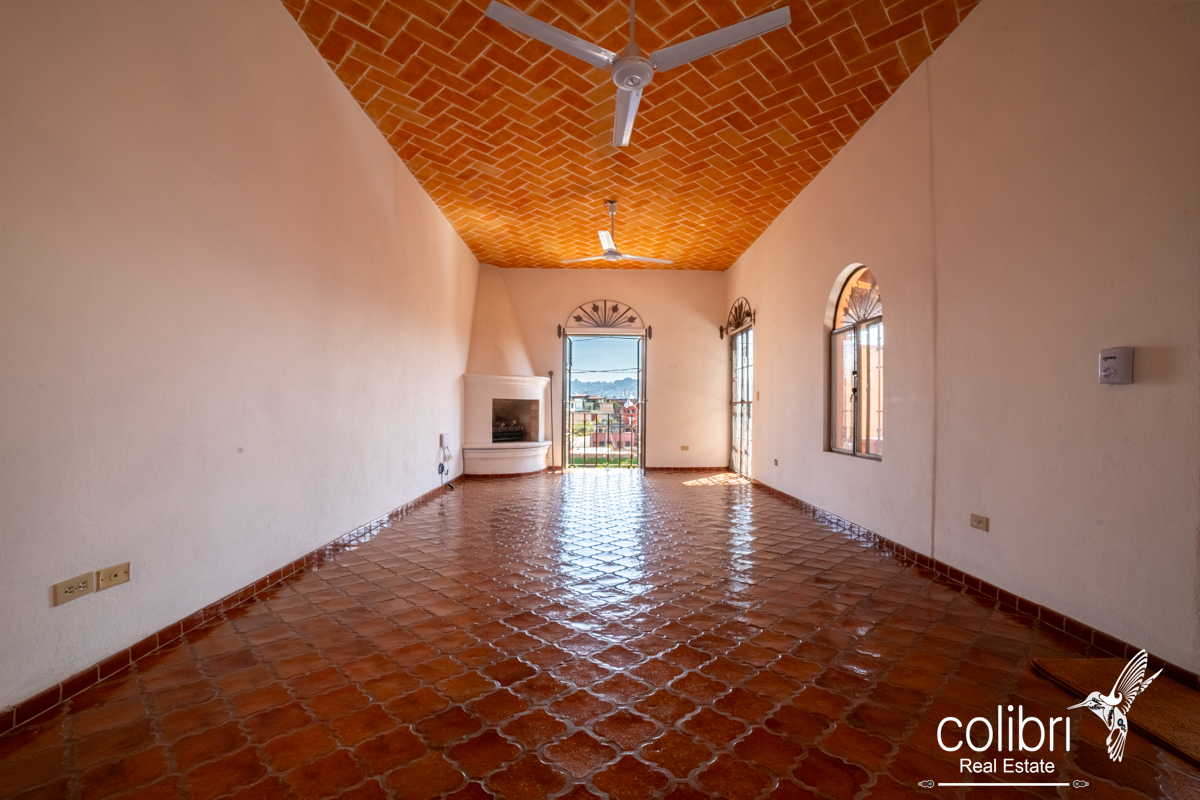 Entering through the first terrace, you’ll find a spacious and welcoming living–dining area, designed in a San Miguel–Spanish style that evokes another era. The terracotta floors, protected with polyurethane, and the red brick ceiling create a warm and elegant atmosphere. A gas fireplace adds a romantic touch for cooler days, while the balcony offers charming views of the surroundings.
