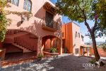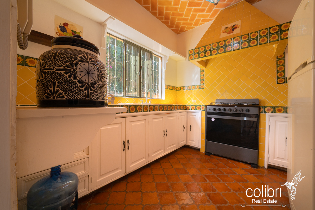 The kitchen, adorned with Talavera tile, enhances the home’s artisanal and traditional character. This level also features a half bathroom with linen storage space.