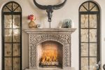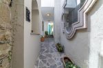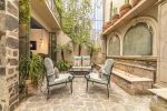 To the right, a spectacular patio welcomes you with a lush tree, flower-filled planters, and a wall adorned with arches and antique mirrors. A water fountain runs along this wall, creating a magical nighttime ambiance with its reflections and soft lighting.