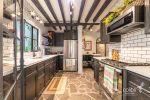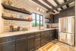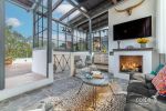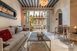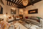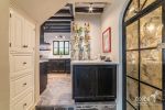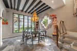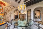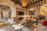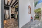 Connected to the patio through folding glass doors, these spaces blend harmoniously with the outdoors. Each has its own fireplace and elegant gray flagstone flooring. The spacious and sophisticated dining room seamlessly flows into a practical, well-equipped kitchen, which also features a special space for a wine cellar.