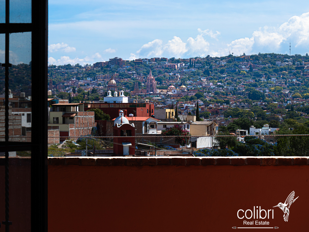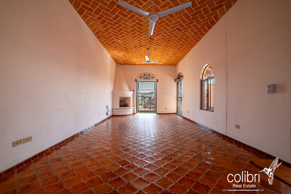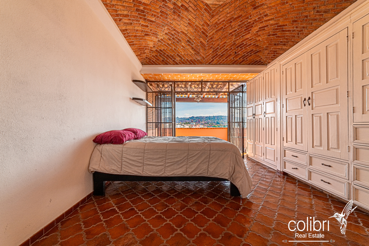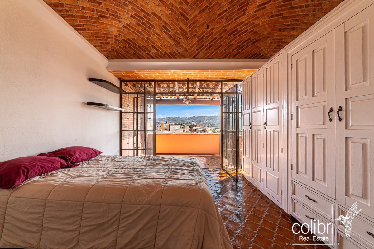 Al subir al siguiente nivel, la recámara principal sorprende con su bóveda artesanal, piso de barro, amplio clóset y un baño con tina lleno de luz natural. Desde su terraza privada, las vistas al centro del pueblo son simplemente encantadoras.